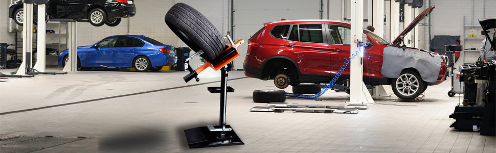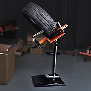 The Tire spreader has a foot-control swivel, tilts, and is equipped with a tool tray and a floor stand base plate.