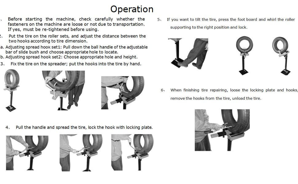 5, the adjustable tire spreader can accommodate all tires from garden service through light-truck,
